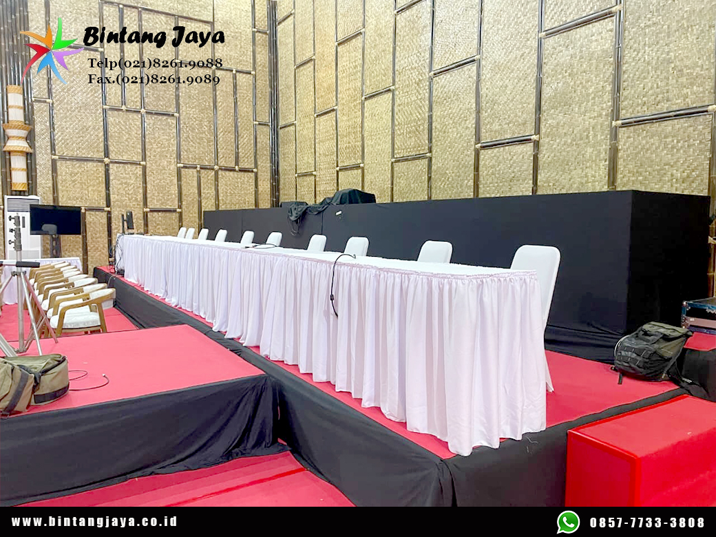 Kami menyediakan layanan sewa meja bundar taplak hitam runner merah Jakarta dengan kualitas terbaik dan siap digunakan untuk berbagai kebutuhan event.