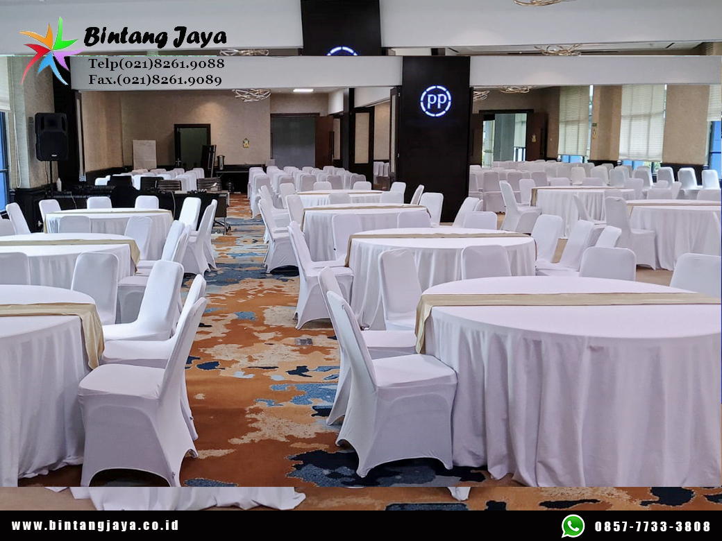 Tidak hanya itu, kombinasi meja bulat, meja kotak, serta kursi dengan cover putih juga memberikan kesan bersih dan elegan. Oleh sebab itu, perlengkapan ini sering digunakan pada berbagai acara formal maupun nonformal di Depok dan sekitarnya.