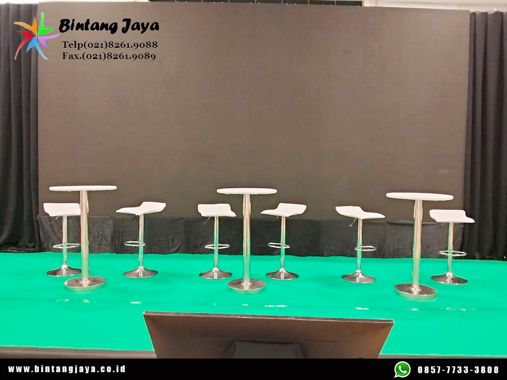 Selain itu, kombinasi barstool putih dengan kursi kotak dan panggung mampu menghadirkan tampilan yang stylish sekaligus elegan. Dengan demikian, area acara terlihat lebih tertata dan menarik perhatian tamu.